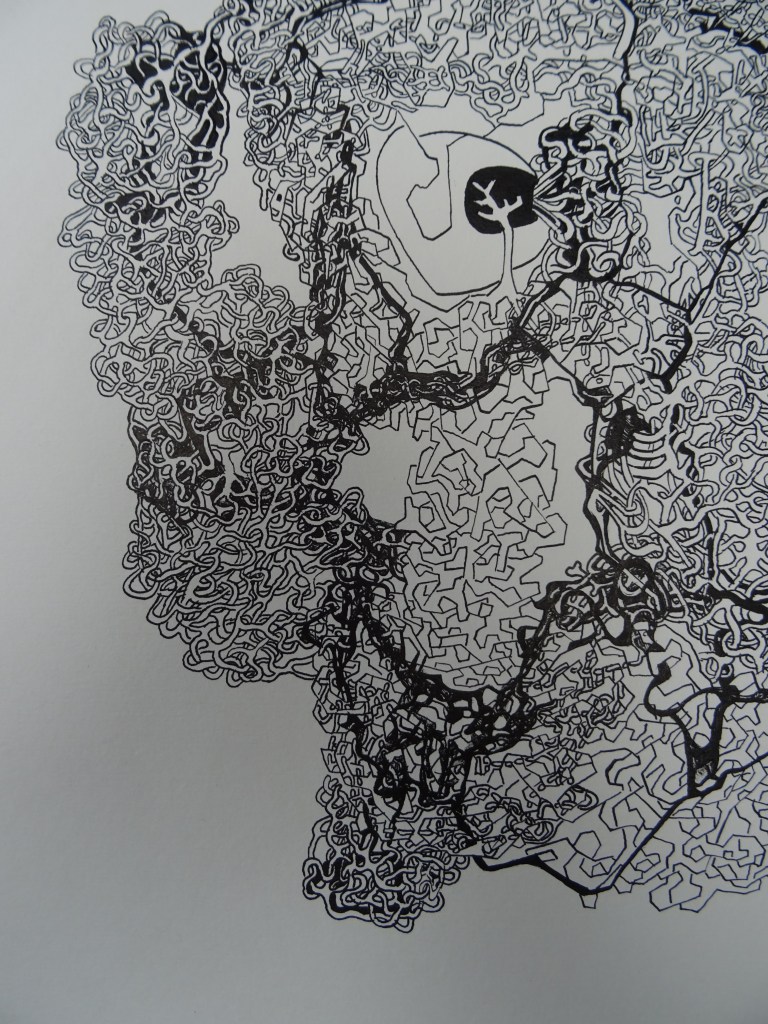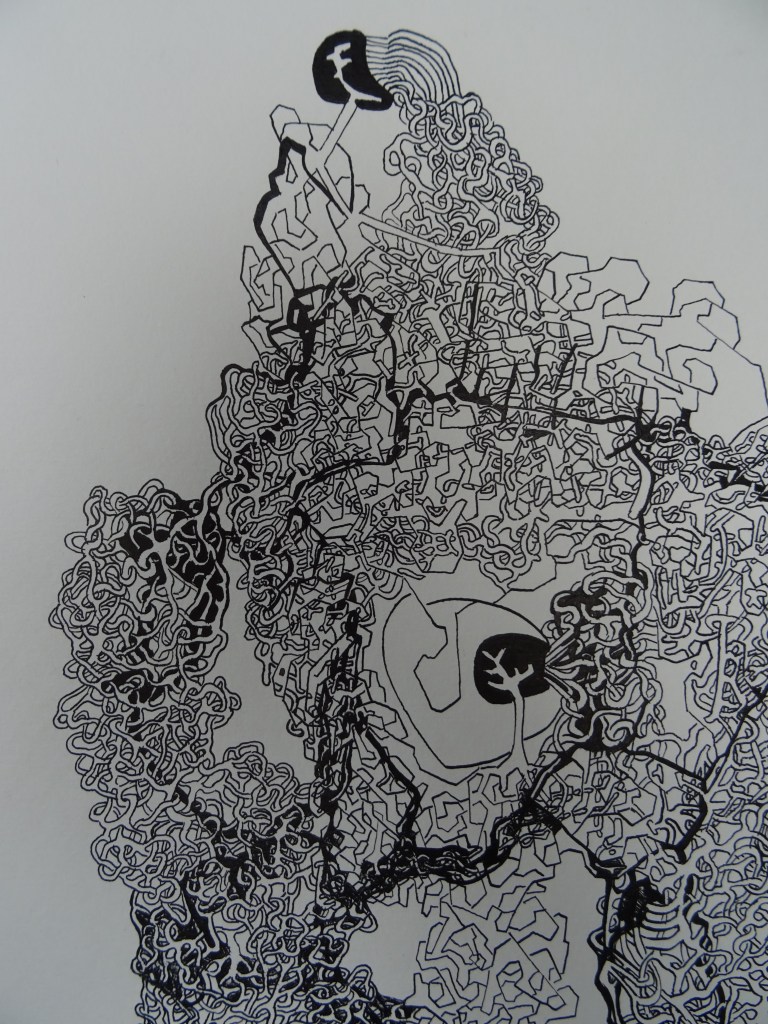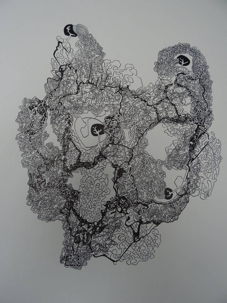 L’arborecence jaillit de ma structure qui semble produire ces entrelacs qui finiront eux-même par donner cette structure réfractable; comme si mon dessins composait son propre écosystème où les choses se génèrent d’elles-mêmes et suivent un cycle.