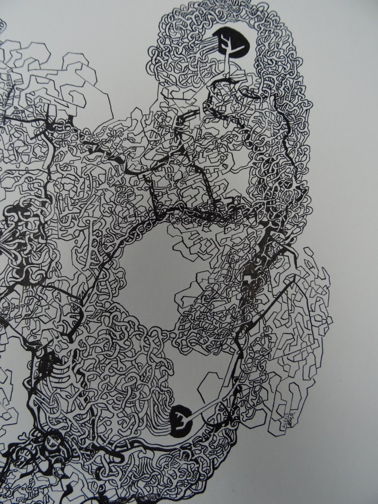 Cela a été une période où j’ai développé cette arborescence qui produit cette forme ronde noire d’où semble sortir mes entrelacs, un peu comme un genre de méduse.