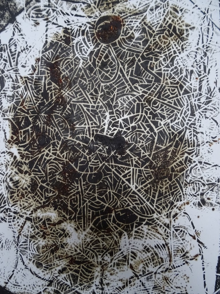 Avec cette plaque gravée, j’ai commencé à utiliser de nouveaux types d’encres plus « rudimentaires » dans les composants, où j’ai notamment encré jusqu’à boucher des creux de la plaque. Ces zones, lors du tirages, ont alors été prises dans le papier durant l’impression, pour générer un relief du motif gravé.