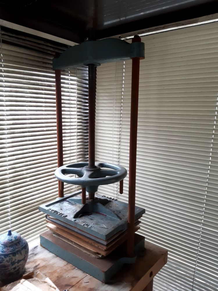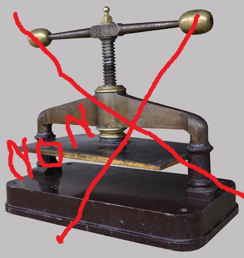 Ce n’est pas une presse de relieur, c’est une presse de notaire, cela servait auparavant à réaliser des duplicata avec le document original et du papier carbone, cela n’a rien à voir avec la reliure et n’a aucune utilité pour moi. Il n’y a d’ailleurs pas de système de vis à percussion pour permet d’aller au-delà du pressage. A voir si cela peut être utile dans la confection des hamburgers.