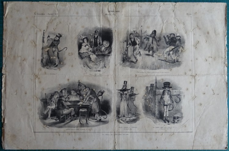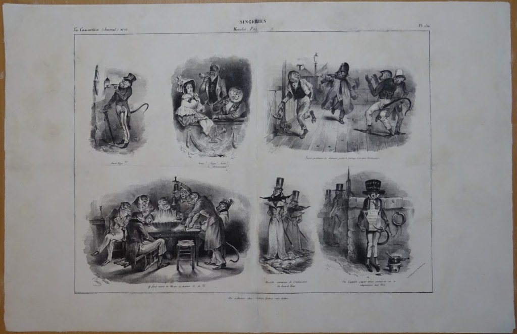 il s’agit de « Singeries », une carricature âgée de 192 ans. Une lithographie issue d’un journal édité par la même maison qui publiait Georges Sand, Robida, Nodier et Balzac entre autres; dont la libraire se situait dans une galerie couverte de Paris. On est ici en pleine Monarchie de Juillet, dans un climat pré-insurectionnel. Cet estampe raconte cette période précise, elle témoigne de notre patrimoine en matière de satyre et de dessin de presse, elle est aussi un prototype de ce qui deviendra la Bande Dessinée. On voit ici une série d’anamorphoses, réalisée à 4 mains par Grandville assisté par Forest. Grandville est un amateur de la Physiognomonie, une pseudo-science disparue après des usages funestes. Grandville est un illustrateur illustre, qu’on retrouve dans des publications anciennes des Fables de la Fontaine et du Voyage de Gulliver. Cette estampe est dans deux musées parisiens, dont la maison parisienne de Balzac qui possédait un exemplaire de cette estampe.