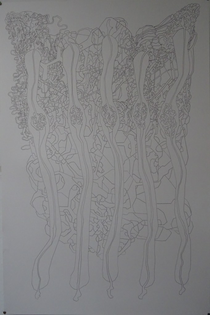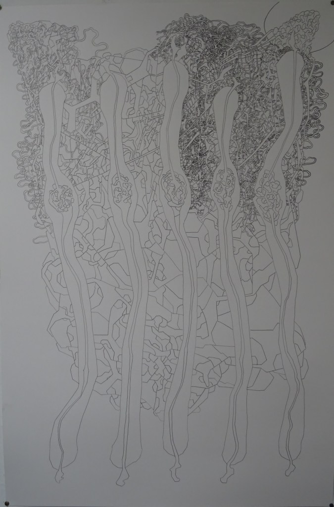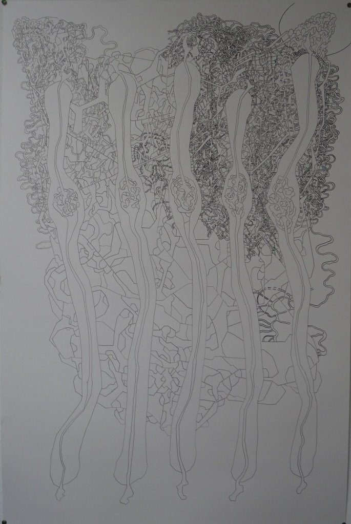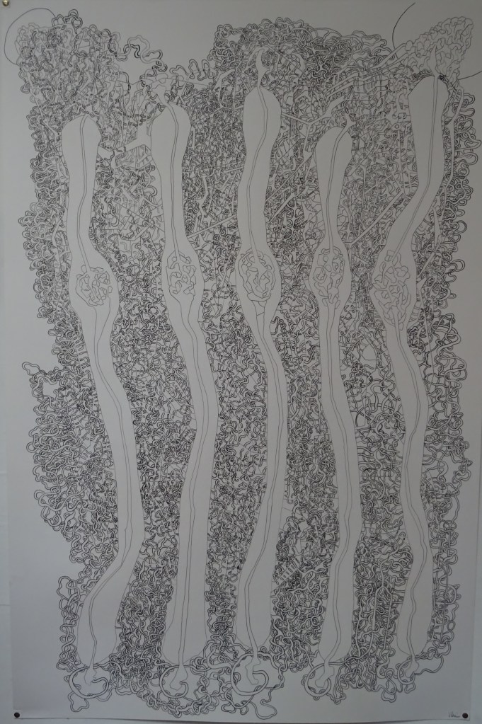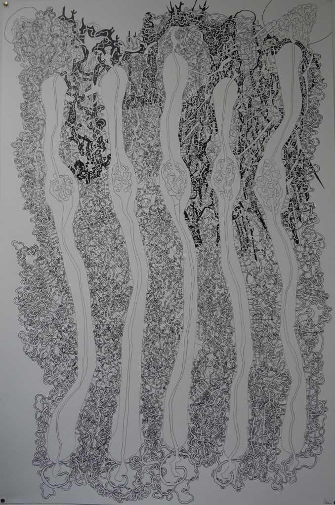 C’est aussi mon grand dessin le plus dense, le plus rempli et il est donc très abouti et ce que je fais en format A4 ou A5 prend évidemment une toute autre ampleur.