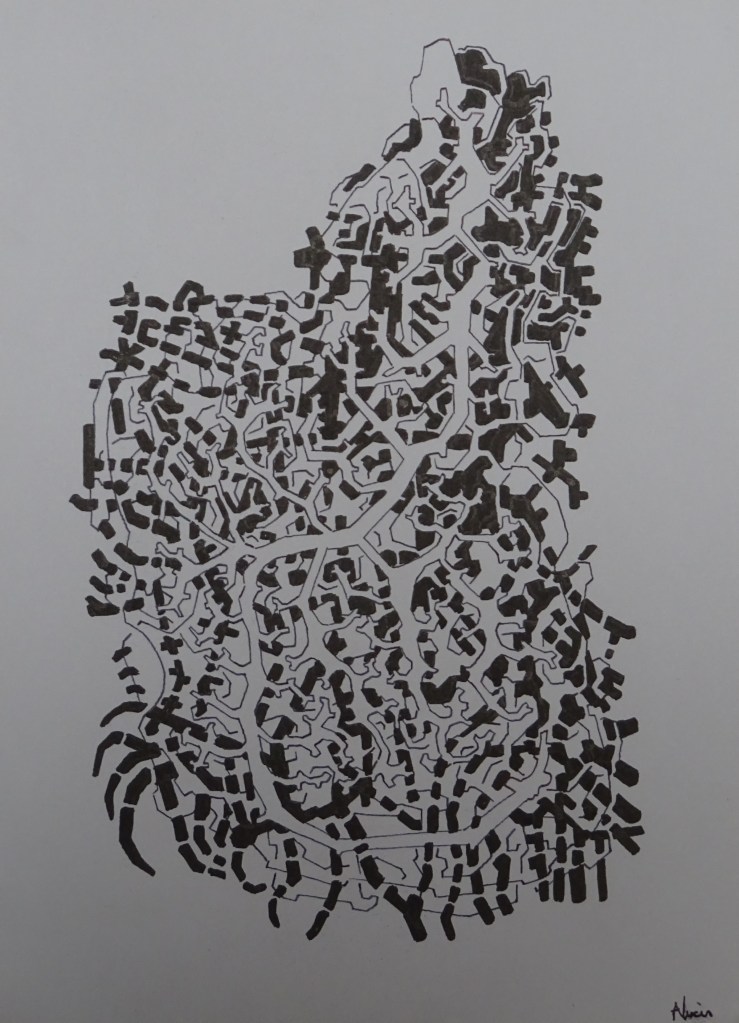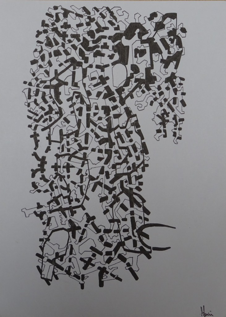 Croquis format A4, plume et feutre d’encre de chine sur papier dessin.