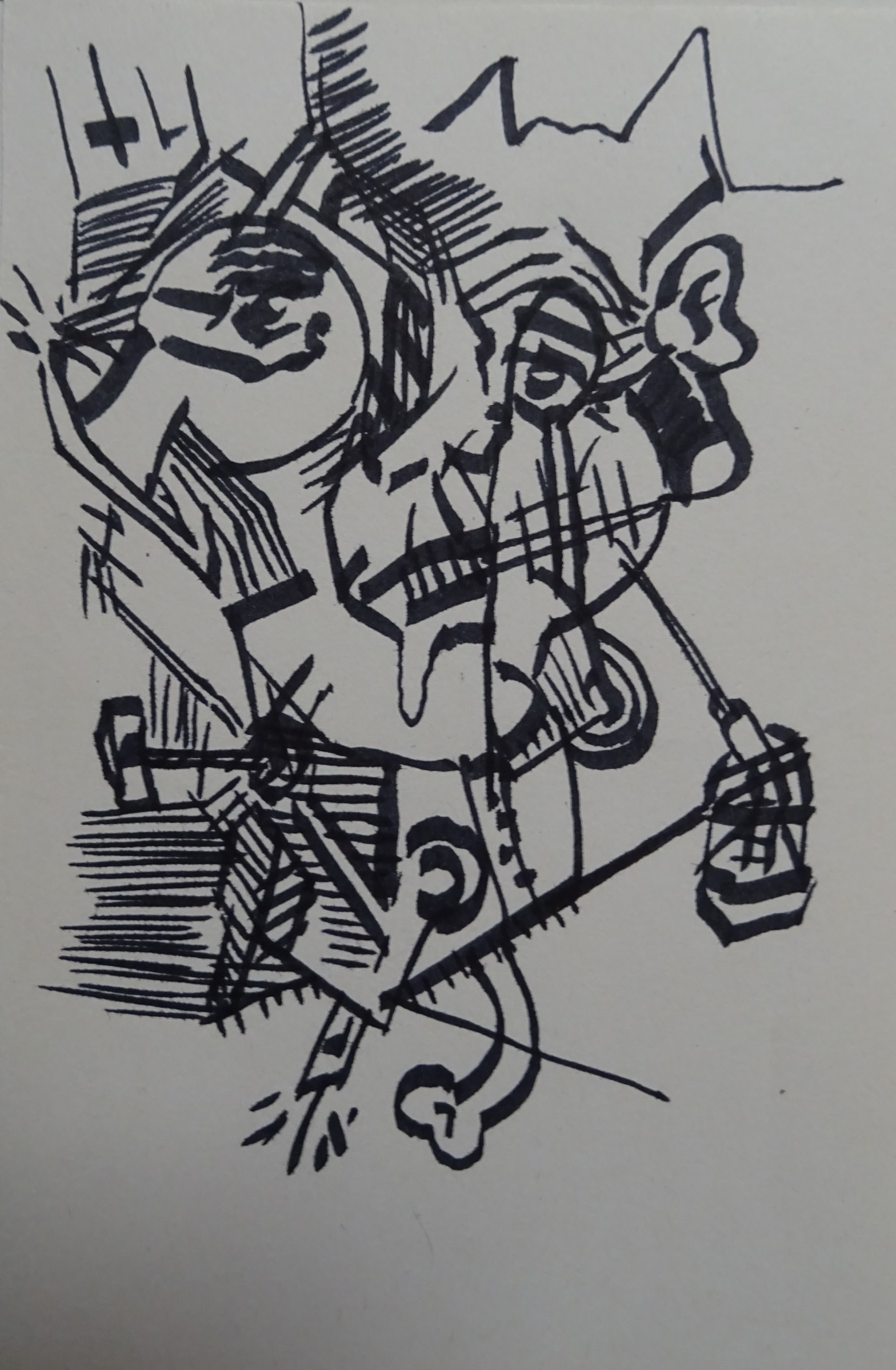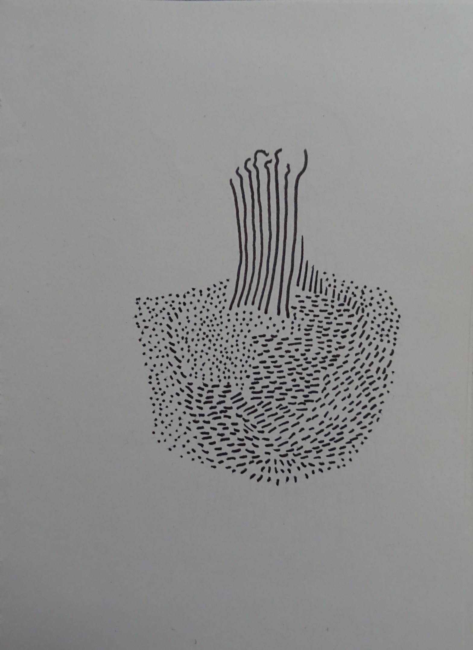 Croquis format A4, plume et feutre d’encre de chine sur papier dessin.